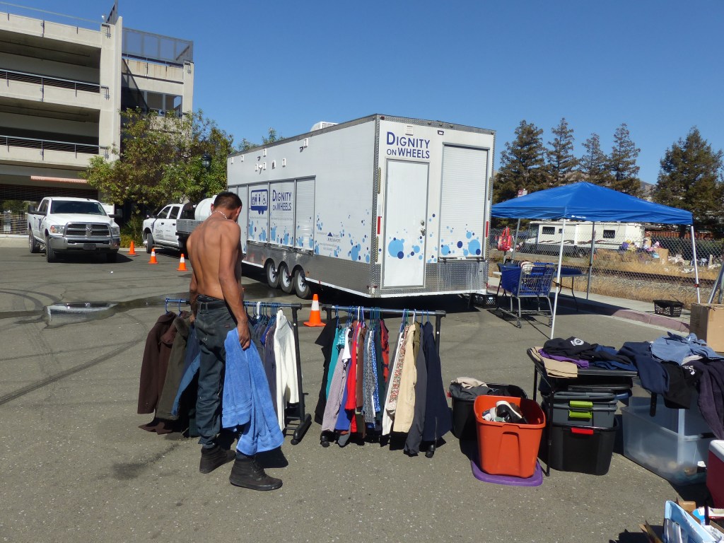 Every Sunday, near the Milpitas Library, Dignity on Wheels provides a mobile Showers and Laundry service for the homeless. H4U has started operating a Mobile Service Center there as well, providing clean clothes, meals, and phone charging stations. Through a partnership with The United Effort Organization, they are also able to hand out free cell phones.